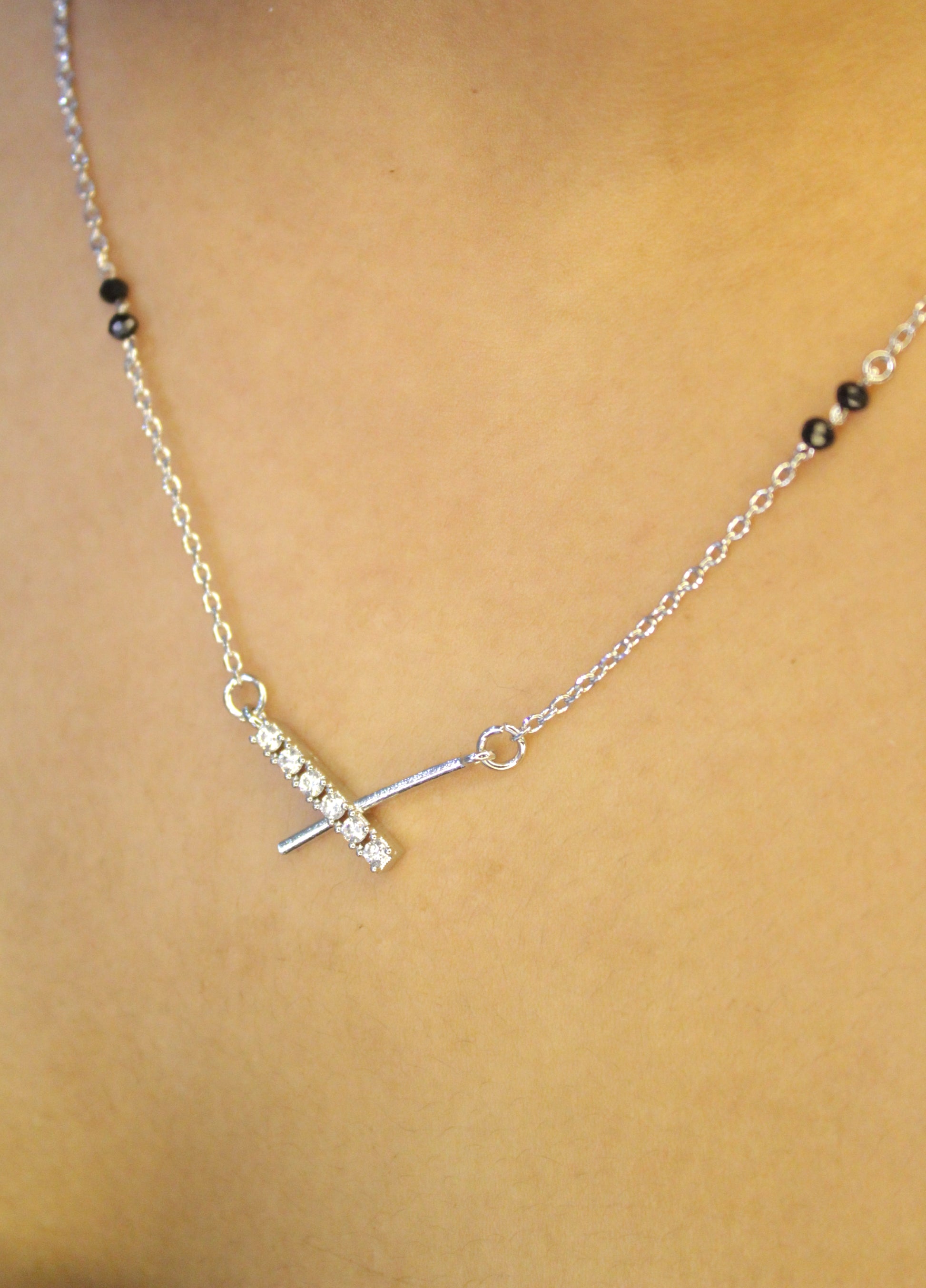 A timeless symbol of love and commitment, this 925 sterling silver mangalsutra is crafted with elegance and purity. Designed for modern women, it blends tradition with contemporary style—perfect for daily wear and special occasions. Designed for comfort and long-lasting shine, this sterling silver mangalsutra is ideal for everyday wear. Its minimal yet meaningful design reflects love, strength, and timeless beauty.This beautifully crafted sterling silver mangalsutra features traditional black beads paired with a refined silver finish. A timeless piece that complements both ethnic and western outfits.